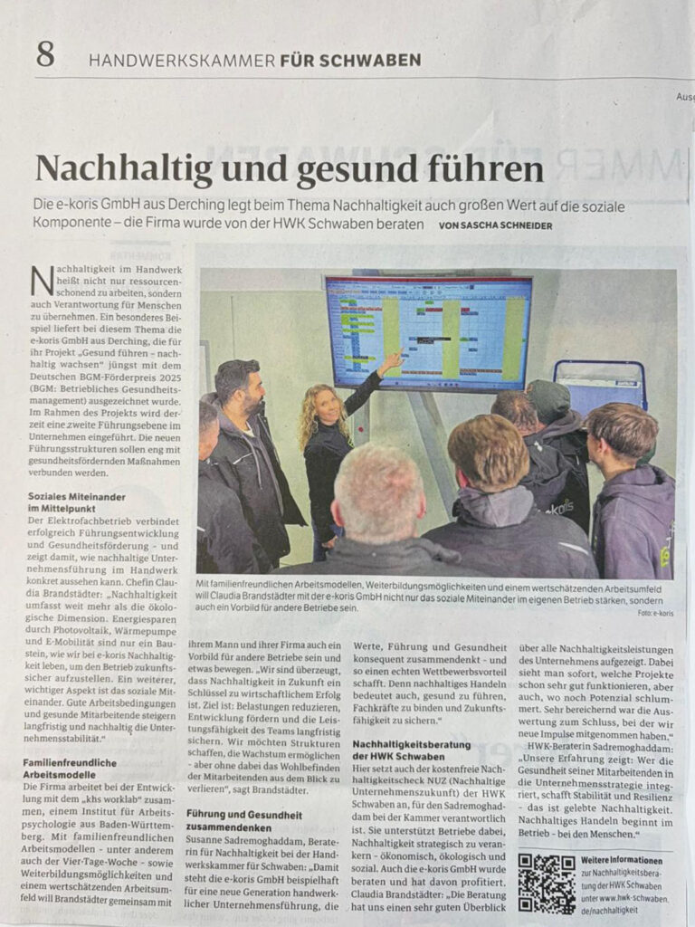 Hier erschienen: Zum PDF Auszug aus dem Artikel Nachhaltig und gesund führen Nachhaltigkeit im Handwerk heißt nicht nur ressourcenschonend zu arbeiten, sondern auch Verantwortung für Menschen zu übernehmen. Ein besonderes Beispiel liefert bei diesem Thema die e-koris GmbH aus Derching, die für ihr Projekt „Gesund führen – nachhaltig wachsen“ jüngst mit dem Deutschen BGM-Förderpreis 2025 […]